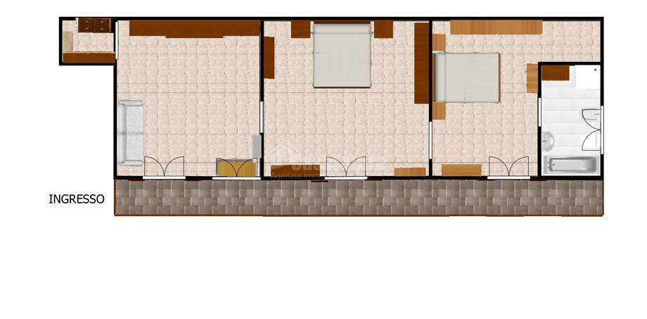 Gli spazi interni si aprono con un ampio ingresso, cucina seguita da due camere spaziose, luminose e facilmente adattabili a diverse esigenze abitative. Entrambe affacciano su un balcone comunicante con esposizione interna, una caratteristica preziosa che garantisce silenzio, privacy e tranquillità.
