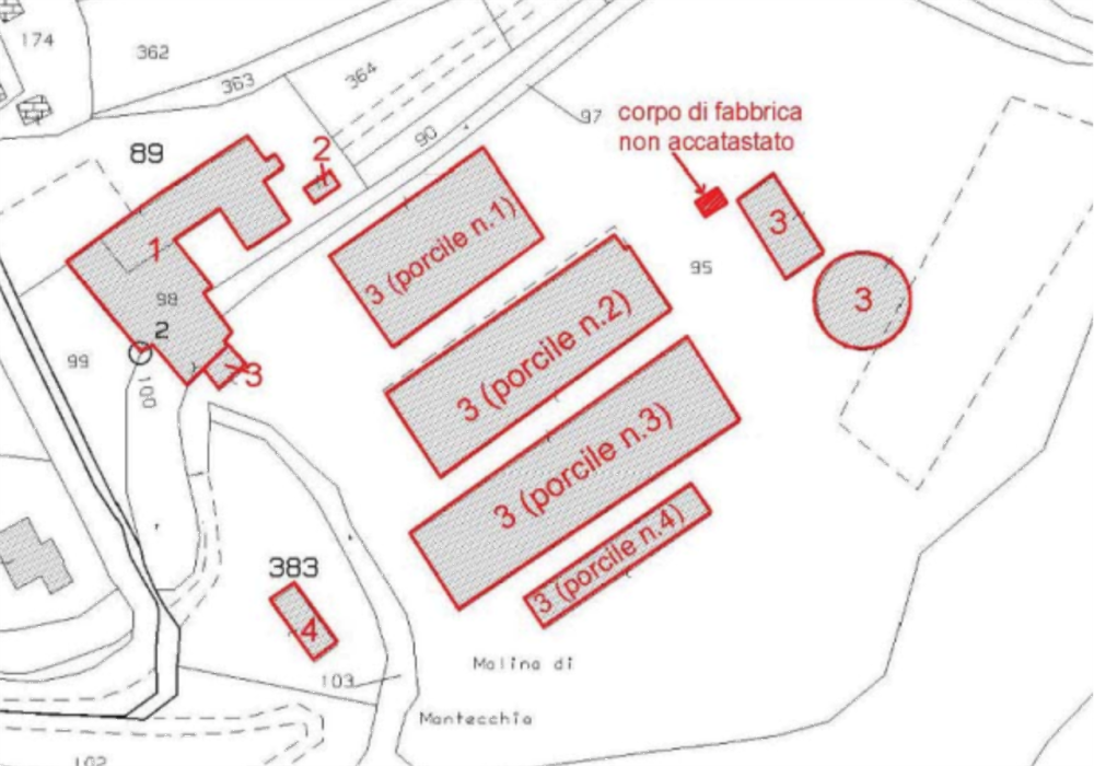 -quattro strutture ad uso porcili che si sviluppano su un unico piano fuori terra e un immobile utilizzato come magazzino (silos) che si sviluppa su due piani fuori terra.