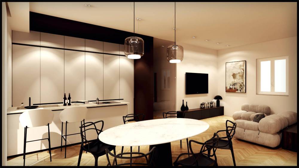 L’appartamento, essendo totalmente da ristrutturare, offre la massima libertà progettuale. La soluzione che proponiamo in planimetria prevede un ingresso su ampio salone con zona cottura, due camere matrimoniali, due bagni (di cui uno finestrato), una lavanderia, una comoda cabina armadio nella camera principale e un funzionale disimpegno per il reparto notte. Una distribuzione moderna, razionale, pensata per valorizzare ogni metro quadrato.