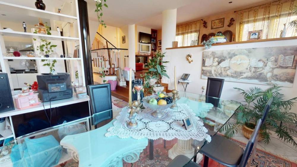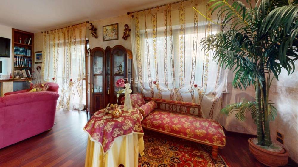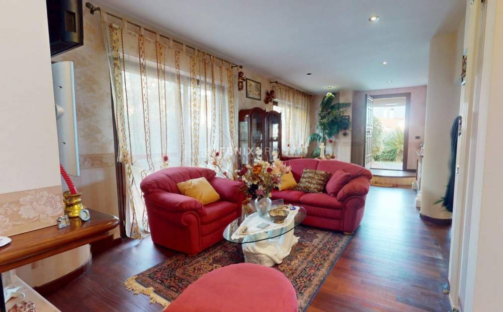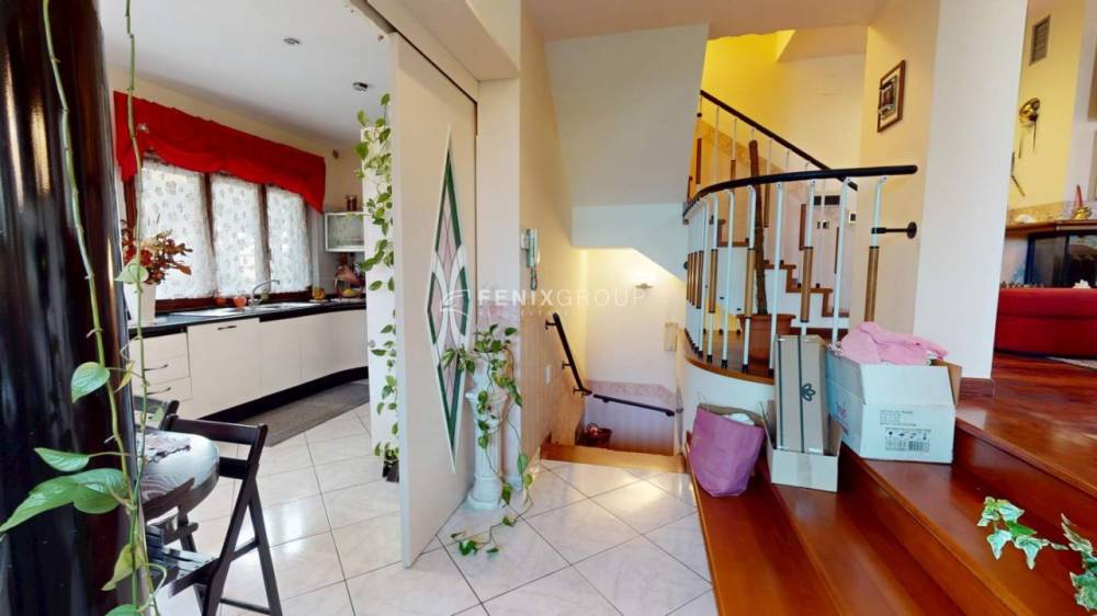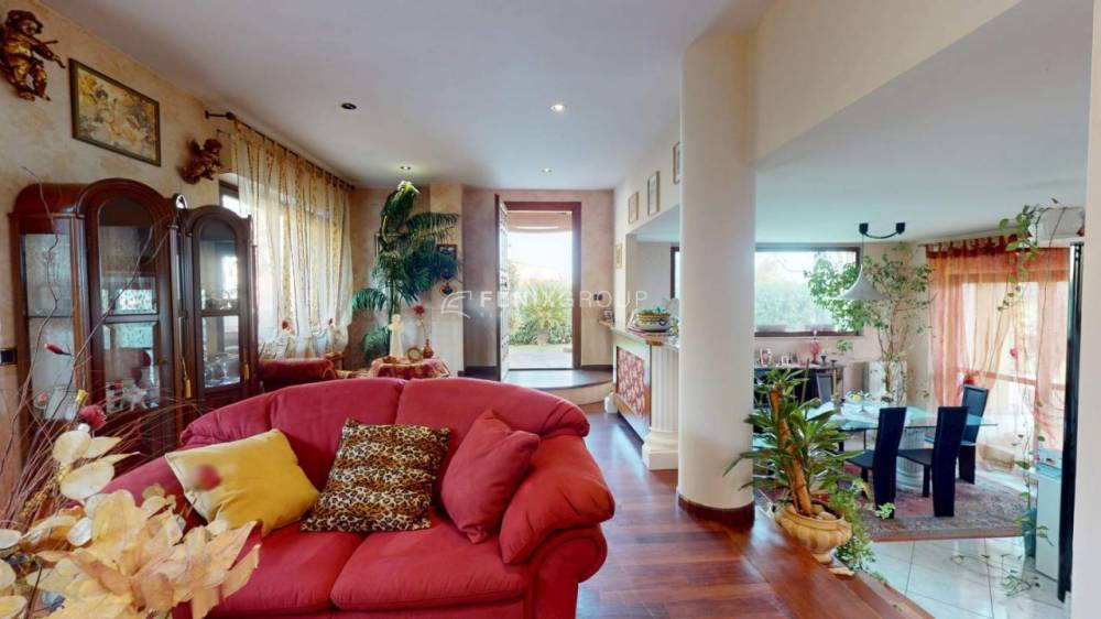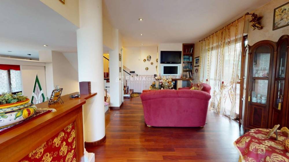 L’ingresso al piano terra introduce a un soggiorno ampio, luminoso e raffinato, caratterizzato da un elegante camino che dona calore e atmosfera all’ambiente.