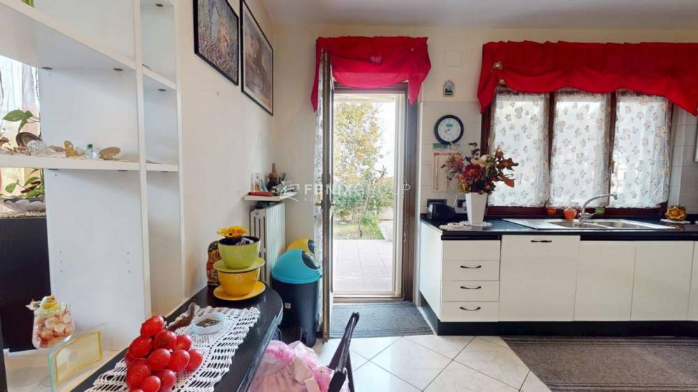 La cucina, separata e funzionale, permette l’accesso diretto all’area esterna pavimentata attrezzata con barbecue, luogo perfetto per cene all’aperto e piacevoli occasioni di relax.