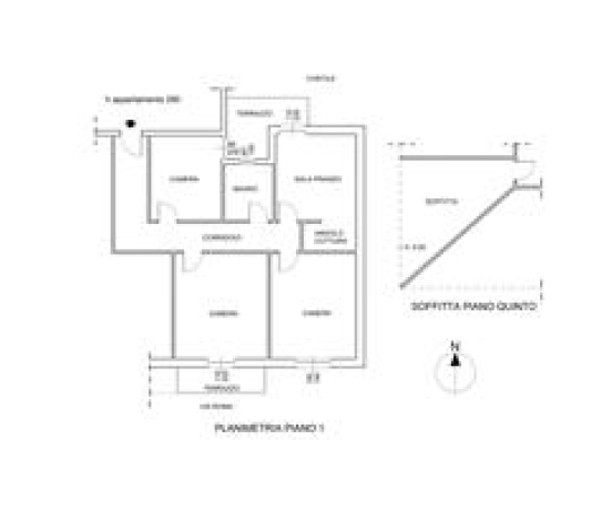 Dall'ingresso si accede ad un corridoio, che disimpegna tutti i vani dell'immobile; si hanno due camere, una a destra ed una a sinistra con accesso al poggiolo comune alla sala da pranzo; successivamente a sinistra si ha il bagno e a destra una terza camera con accesso ad un poggiolo aggettante su Via Roma; in ultimo, a sinistra si ha la sala da pranzo con angolo cottura, con accesso al poggiolo comune alla prima stanza.