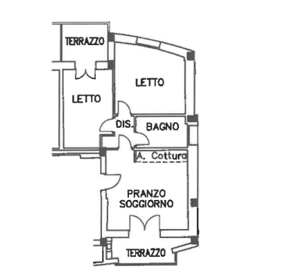 Unità facente parte di un edificio residenziale con ascensore; composto da zona soggiorno/pranzo, angolo cottura, disimpegno, due camere da letto e bagno. Autorimessa di 16 metri quadri.