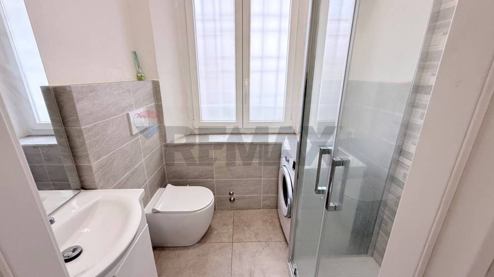Bagno finestrato di circa 3 m², completo di sanitari nuovi, box doccia e lavatrice