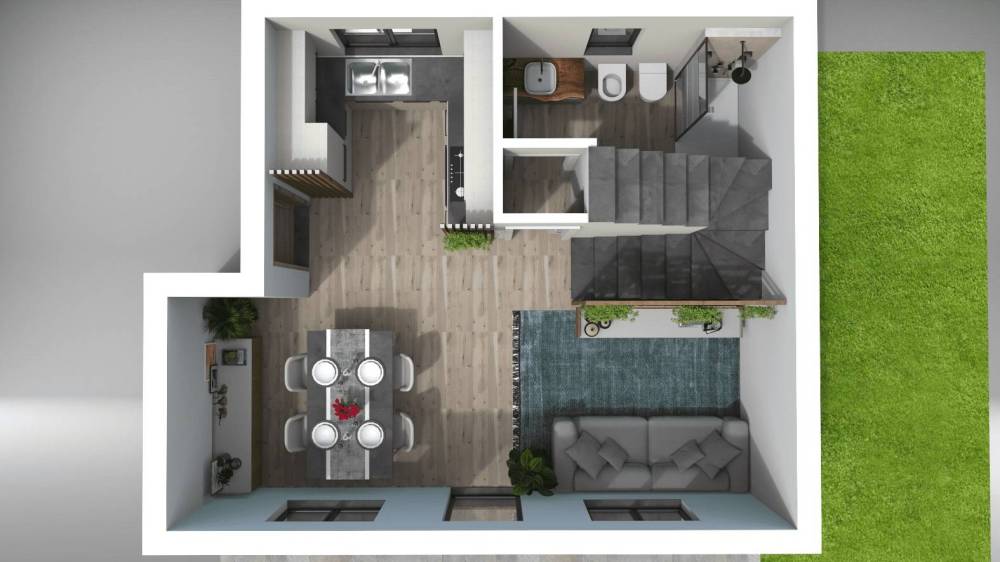 Allesterno, ogni abitazione dispone di un giardino privato, uno spazio da vivere senza fretta. Zone pavimentate per pranzi allaperto, area barbecue già predisposta e angoli verdi ideali per un piccolo orto o semplicemente per godere del silenzio e della natura.