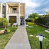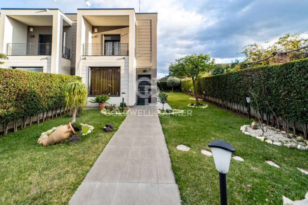 Lampio giardino angolare circonda lintero perimetro della villetta ed è dotato di impianto di irrigazione e illuminazione.