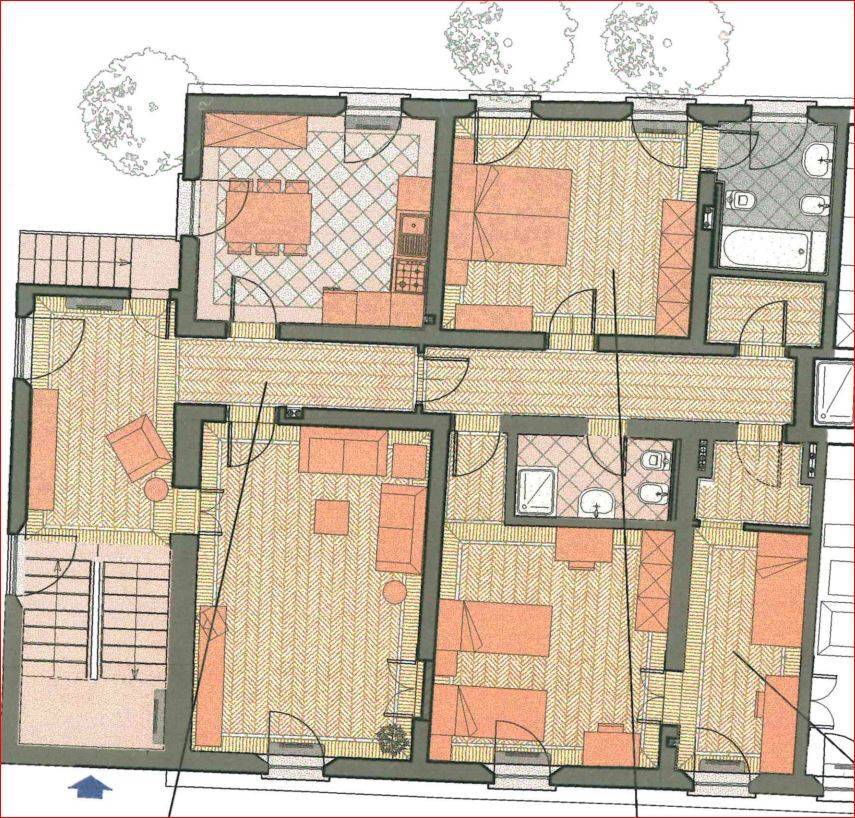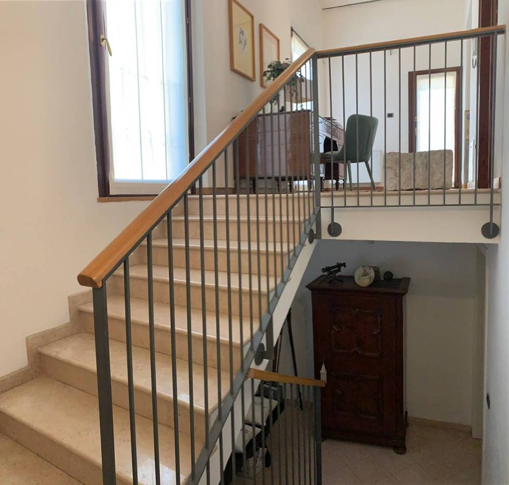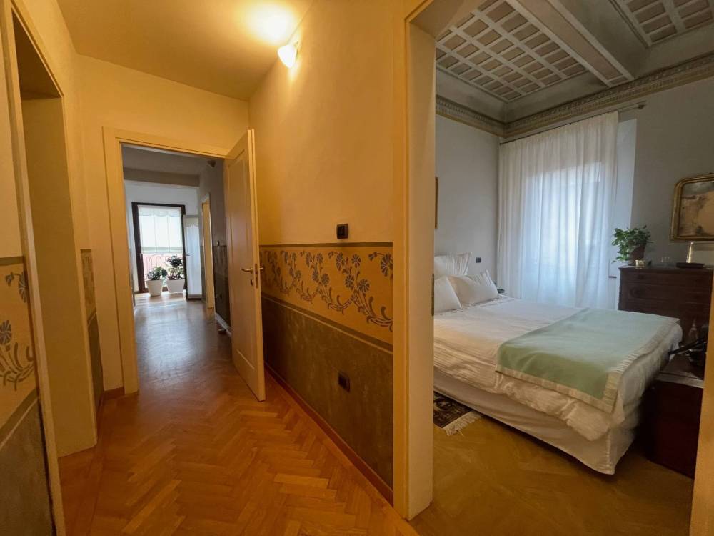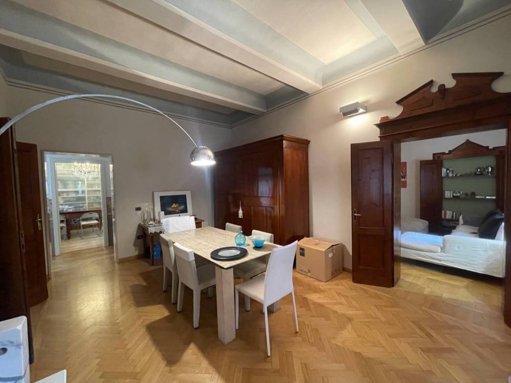 Limmobile è così disposto: Al piano rialzato, una zona ingresso studio ampia e luminosa, cucina abitabile di grande metratura contigua alla zona pranzo soggiorno, generosa stanza adibita a salotto o 3ª camera da letto matrimoniale. Corridoio notte con accesso alla camera padronale con soffitti decorati e bagno privato. Camera singola, cabina armadio, 2º bagno.
