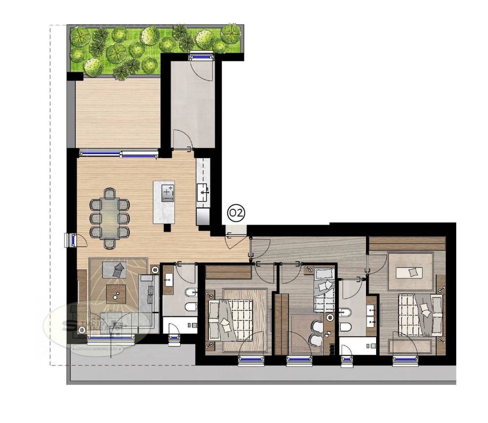 la zona notte dispone di tre camere e un bagno ; un vano tecnico collegato all'appartamento contiene il cuore tecnologico dell'abitazione ;