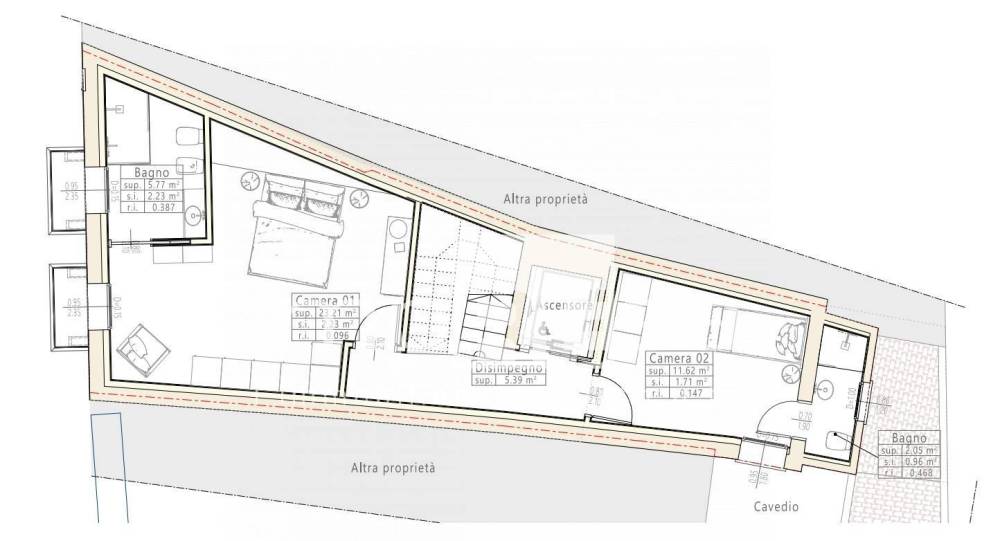 Primo Piano : camera padronale con bagno e cabina armadio - disimpegno - seconda camera con relativo bagno