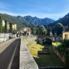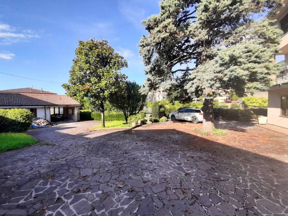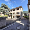 The driveway entrance from Via Cesare Battisti leads to the open parking area, from which you can reach the main building entrance and the outdoor porch on the side of the house, providing access to the...