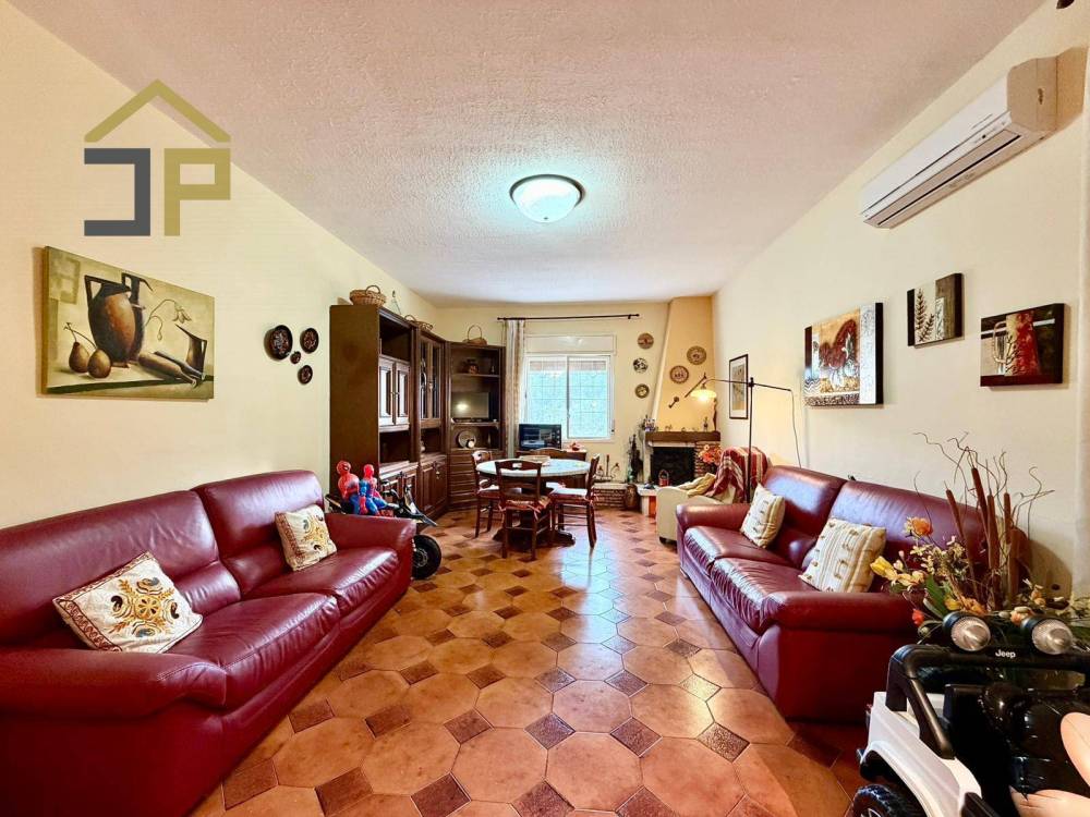 Sulla sinistra, si apre un grande soggiorno, caratterizzato da un suggestivo camino che crea un'atmosfera calda e invitante, ideale per riscaldare le serate invernali trascorse con amici e familiari.