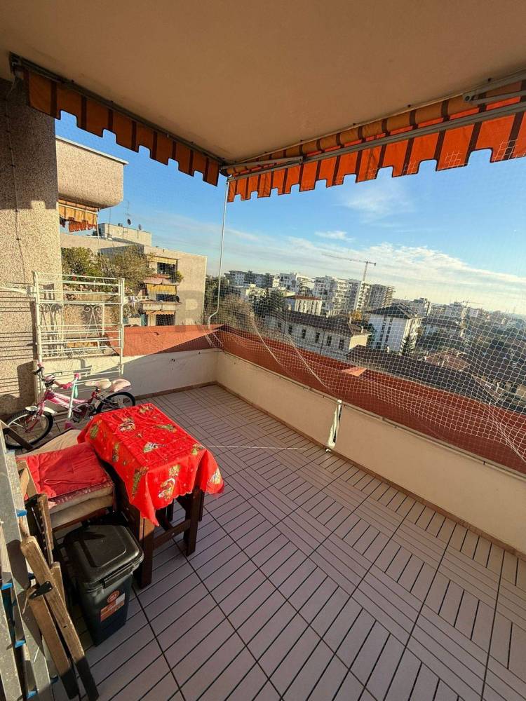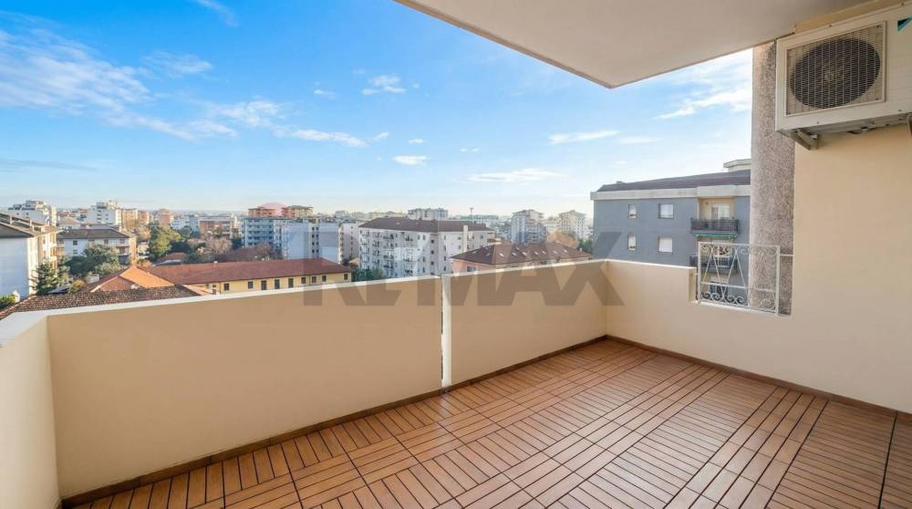 Spazioso trilocale situato al settimo ed ultimo piani 105 mq. è disposta con taglio razionale e moderno composto da ingresso nell'ampio living che racchiude il salone e la cucina entrambe con affaccio su generoso terrazzo di 12 mq esposto a sud e funzionale ripostiglio/lavanderia; la zona notte è composta da due ampie camere matrimoniali e bagno padronale finestrato. A completamento della proprietà, un vano cantina. Spese condominiali 350 mensili omnicomprensive di tutti i servizi incluso il riscaldamento e l'acqua calda. Prezzo richiesto 300.000,00 libero a 3/6 mesi dal compromesso.