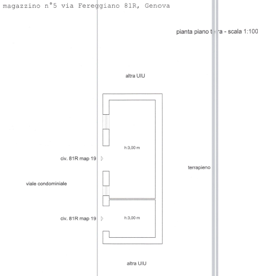 LOTTO 5 - BENE 5 - 1/1 Diritto di proprietà magazzino ubicato a Genova (GE), Via Fereggiano, 81 rosso, p. T, superficie convenzionale mq. 43.Locale ad uso magazzino, con due ampi varchi di ingresso situato in immobile ad un solo piano posto perpendicolarmente ed in tangenza agli edifici di via Fereggiano 39 e 41 e Passo della Zebra 1, avente accesso carrabile e pedonale tramite passaggio privato dal civico 81 rosso di via Fereggiano.