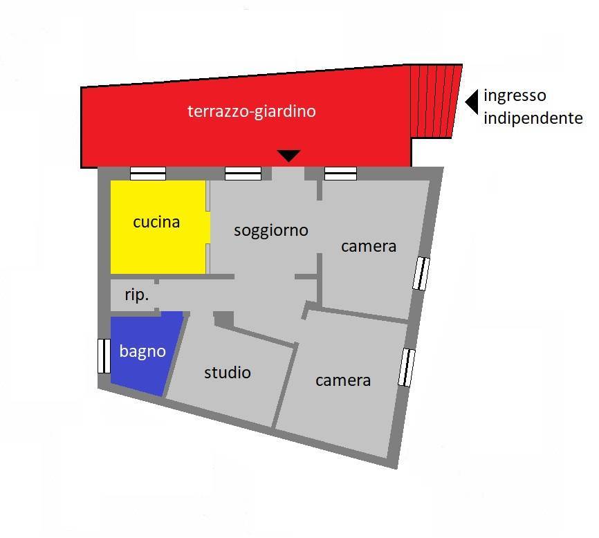 GENOVA PRINCIPE MIRAMARE appartamento con ingresso indipendente tramite ampio terrazzo-giardino in vendita nella parte iniziale di via Pagano Doria adiacente al Miramare di ampi vani 6. Edificio con parti comuni in via di completa ristrutturazione a carico dellattuale proprietario, interni ordinati composti da ingresso - soggiorno - cucina, due camere, studio, bagno, ripostiglio e grande terrazzo giardino di accesso. Si accede allo spazio esterno direttamente dalla strada. Pur essendo un piano basso lappartamento e sufficientemente luminoso. Da vedere!