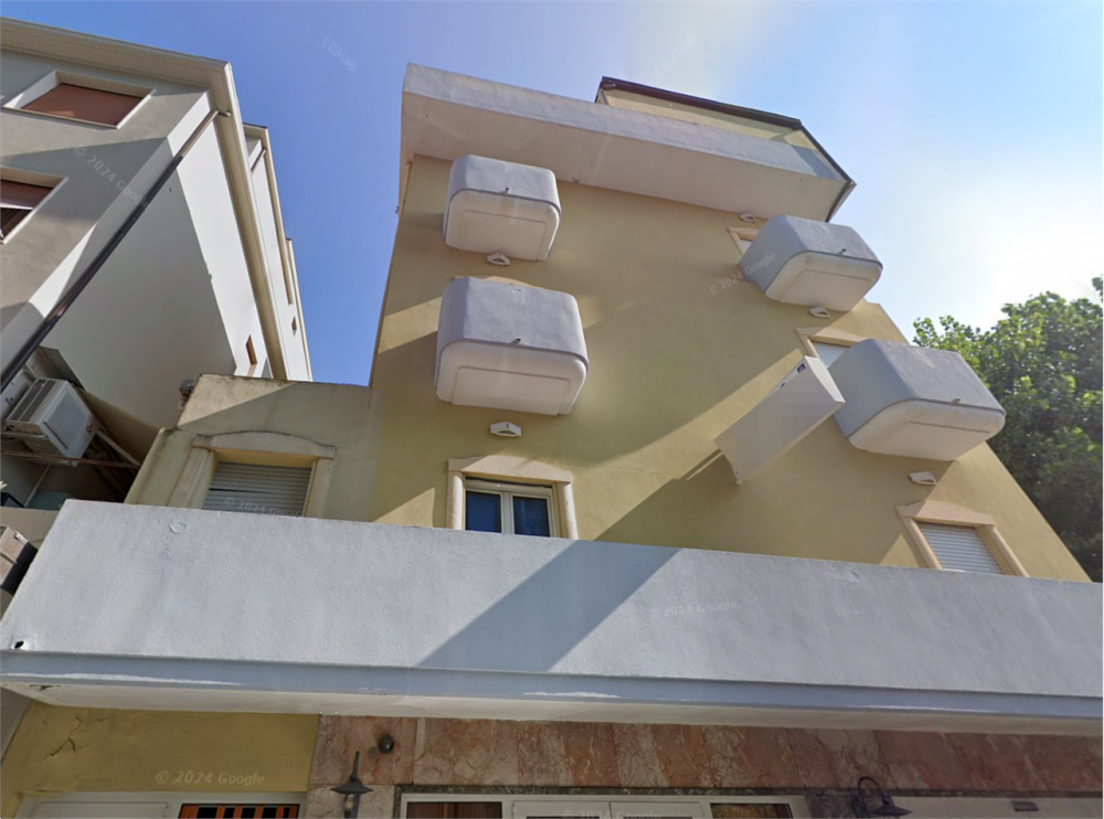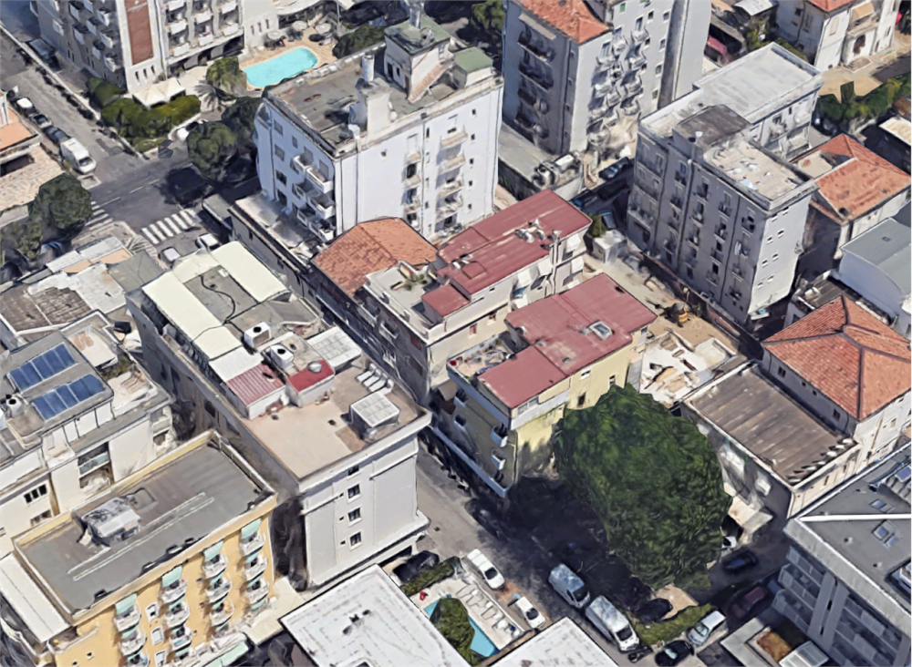 L'immobile è composto: al piano terra da hall/soggiorno/bar, sala da pranzo, sala TV, antibagno, bagno, ripostiglio/spogliatoio personale con antibagno e bagno, deposito bottiglie/sottoscala, cucina, vano scala interno, vano ascensore interno, sala macchine ascensore, portico e corte scoperta/marciapiede (lato strada); al piano primo da sette camere, di cui due singole e cinque doppie, disimpegno/corridoio, terrazzo, deposito, vano scala interno e vano ascensore interno; al piano secondo da sette camere, di cui due singole e cinque doppie, disimpegno/corridoio, vano scala interno e vano ascensore interno; al piano terzo da sette camere, di cui due singole e cinque doppie, disimpegno/corridoio, vano scala interno e vano ascensore interno; al piano quarto da ingresso/salottino, cucina/pranzo, tre camere, bagno, disimpegno, terrazzo, balcone, vano scala interno e vano ascensore interno.
