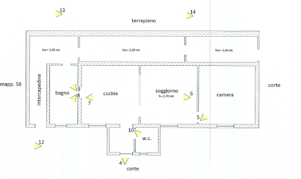 A Appartamento, di superficie commerciale di mq. 81,48, posto al piano terra di piccolo fabbricato, così composto da ingresso, w.c., cucina, soggiorno, camera e bagno nonché ampia intercapedine avente altezza media pari a mt. 2,60 circa.