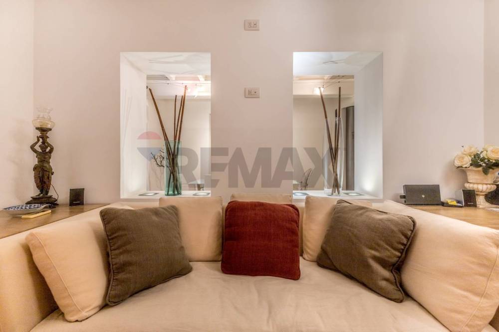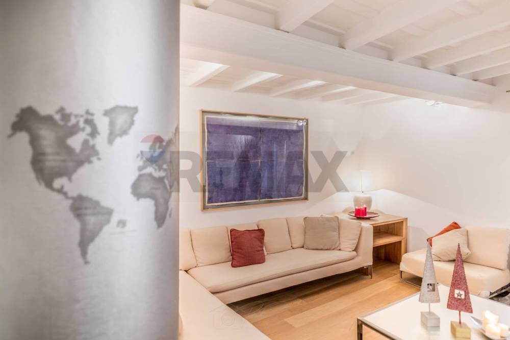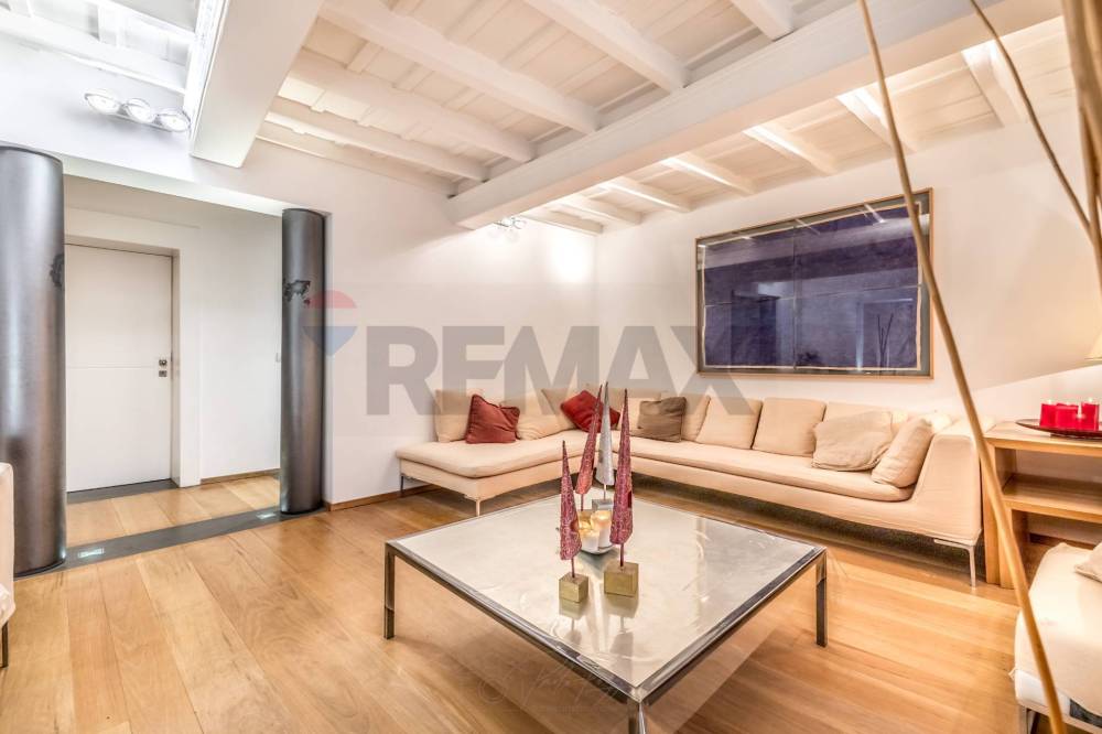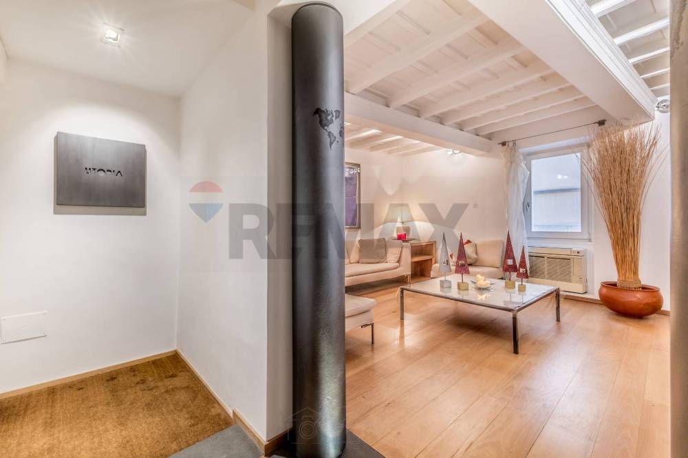 Lingresso accompagna verso un ampio soggiorno di rappresentanza, cuore pulsante della casa, caratterizzato da volumi importanti, soffitti con travi a vista e una luminosità diffusa che valorizza i materiali e le proporzioni degli ambienti. Gli affacci su Via Vittoria conferiscono carattere e respiro agli spazi, senza rinunciare a una piacevole sensazione di riservatezza.