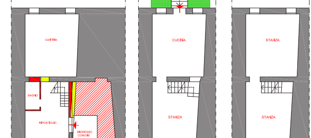 Trattasi di porzione su più livelli, così distribuiti: al piano seminterrato, una cantina e un ripostiglio, con diritto di accesso dalla corte comune, rivolto su una corte esclusiva; al piano terra (rialzato), un'ulteriore corte esclusiva, dalla quale si accede alla cucina ed al retrostante soggiorno; scala per accedere al piano seminterrato e ai livelli superiori; al piano primo, due locali, privi di servizio igienico; al piano secondo (sottotetto) il granaio.