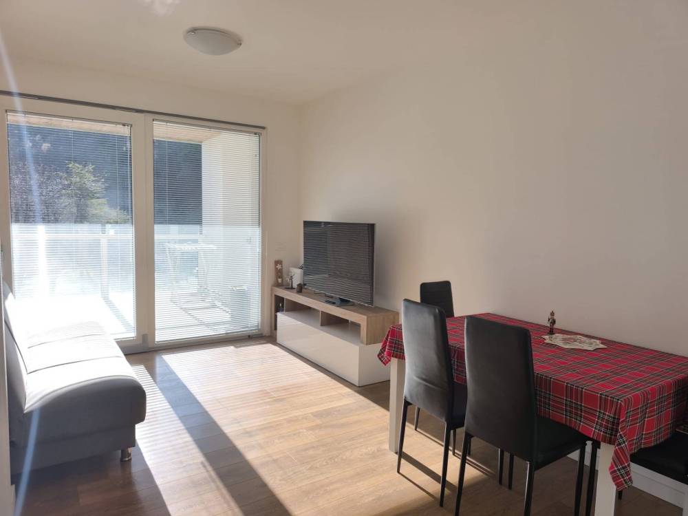 ingresso su luminoso soggiorno con angolo cottura, con affaccio diretto su un ampio terrazzo coperto, completamente esposto al sole, ideale per pranzi allaperto e momenti di relax.