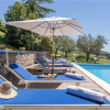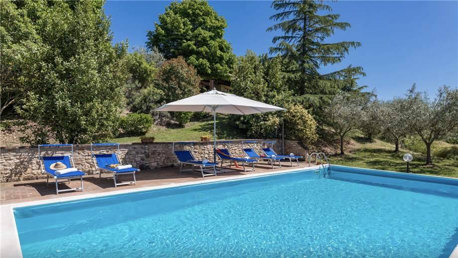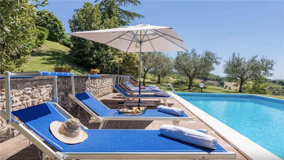 La piscina si trova su un terrazzamento inferiore rispetto alla villa e gode di una posizione riservata e panoramica verso vigneti, uliveti e verdi colline che la circondano. La sua forma è rettangolare, misura 5 x 10 m con una profondità costante di 1,40 m ed è illuminata al suo interno. La vasca ha il bordo in travertino, è depurata a cloro, rivestita in PVC e vi si entra per mezzo di una scaletta metallica. L'area solarium di circa 50 metri quadrati è in parte pavimentati con mattonelle e in parte coltivata a prato ed è dotata di illuminazione alla sera.