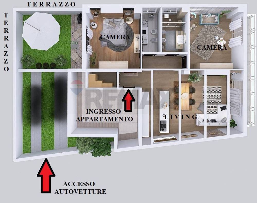 L'appartamento al piano terra rialzato ha l'accesso carrabile indipendente che porta ad un terrazzo privato utilizzabile sia come parcheggio che come area esterna attrezzata per l'estate. Gli interni del piano terra comprendono un ampio soggiorno con angolo cottura, tre camere da letto, un bagno principale e una lavanderia con doppio servizio, inoltre l'appartamento gode di doppia esposizione; l'immobile è dotato di impianto autonomo di riscaldamento e raffrescamento tramite fancoil, cappotto termoisolante, infissi a taglio termico di ultima generazione, pannelli fotovoltaici.
