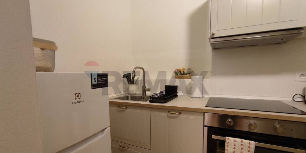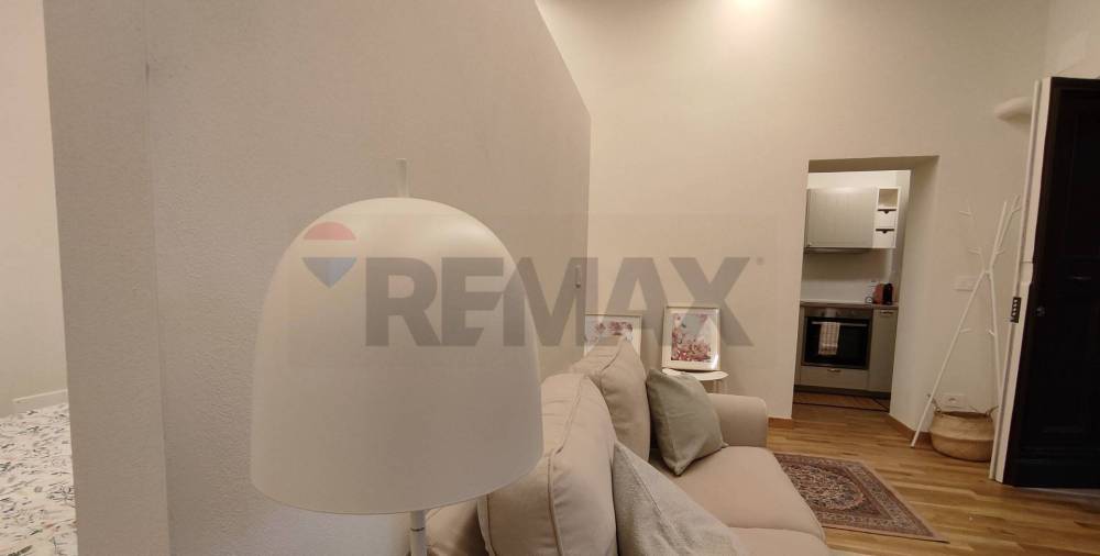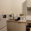 ingresso sull'ambiente open space diviso con muretto, cucinotto in nicchia fornito di tutti gli elettrodomestici ( lava/asciuga, frigo, forno, microonde, piano cottura ad induzione, macchinetta caffè a cialde, lavastoviglie).
