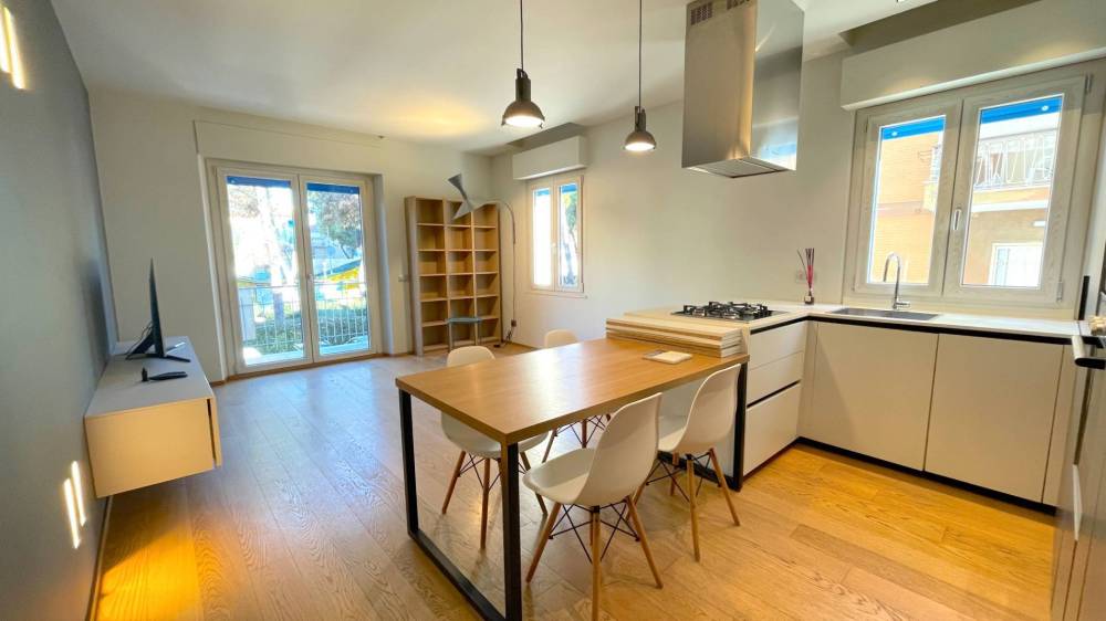 Appartamento al Piano Primo - completamente ristrutturato ed arredato - delle dimensioni di 72 mq. circa, composto da ingresso, soggiorno con cucina a vista (comprensiva di angolo lavanderia), corridoio, 2 camere da letto (matrimoniale con bagno en-suite e singola), bagno principale e 2 balconi di complessivi 10 mq. circa.