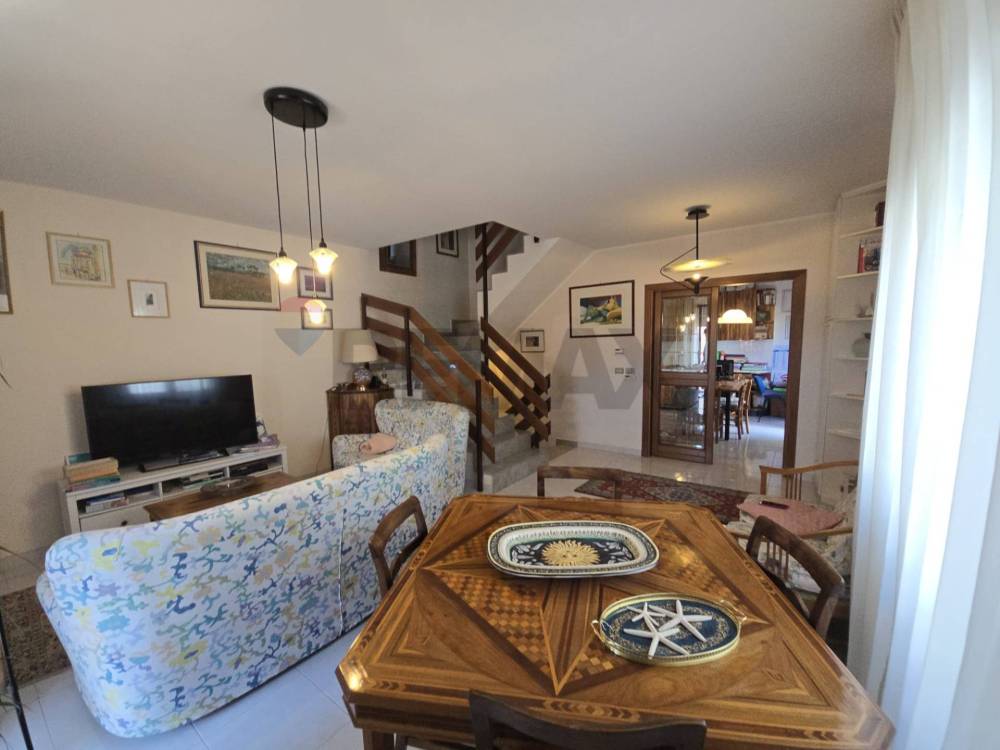 L'immobile si estende su più livelli collegati da scala interna. Dall'esterno si accede facilmente al fulcro principale dell'abitazione: luminoso salone e cucina abitabile entrambi con accesso diretto al giardino privato. Al piano antibagno e bagno. La scala ci porta al piano superiore dove ci sono tre camere da letto e un bagno. Dai balconi possiamo godere di un bellissima vista libera sul mare.