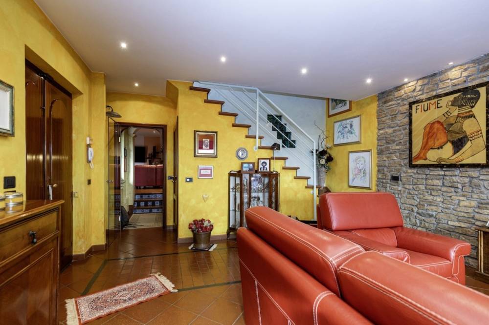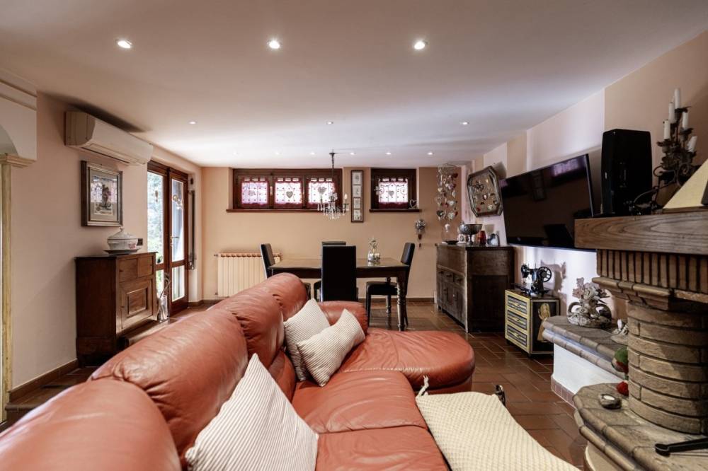 Il piano inferiore è costituito da un ampio vano con affaccio direttamente sul giardino, ideale come ambiente ricreativo o studio