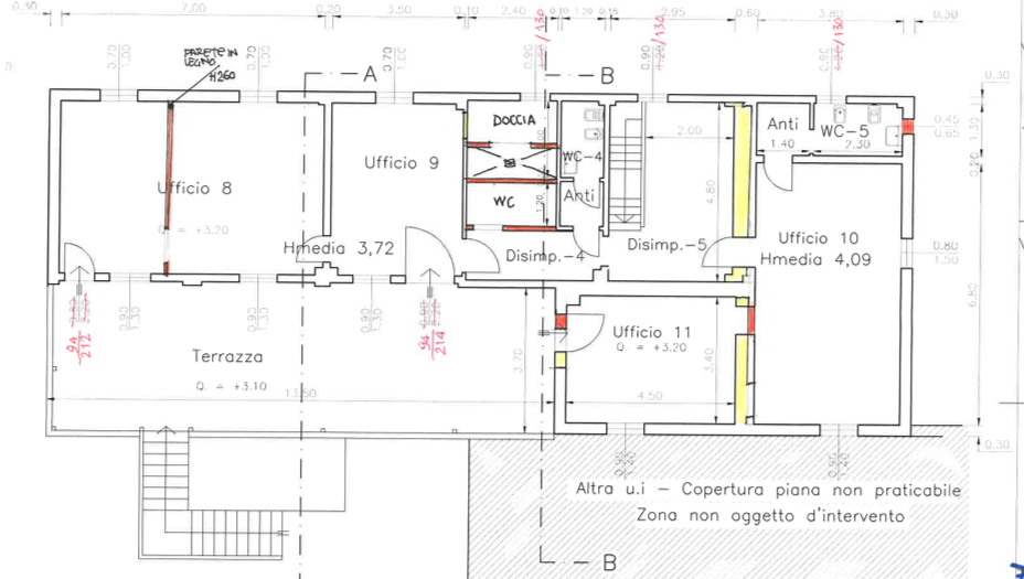 L'unità a uso ufficio ubicato al piano terra, composta da un ingresso, una reception, cinque locali uso ufficio, un disimpegno, un wc ed un locale ripostiglio, a detta porzione del piano terra si giunge attraverso un'area cortiliva. Sempre a detto piano ma non collegati con i restanti vani del piano terra è presente un locale ufficio con due wc e relativi antibagni e scala interna che porta ai locali del piano primo. Al piano primo si arriva attraverso una scala esterna e terrazza sempre passando dall'area cortiliva antistante, a detto piano sono presenti 5 locali ad uso ufficio, due disimpegni, due wc con anti bagno, un bagno ed un locale doccia oltre alla scala interna che porta al piano terra. Al piano interrato è presente un locale deposito/cantina, con accesso da una scala esterna che dal piano terra conduce all'interrato con soprastante copertura.