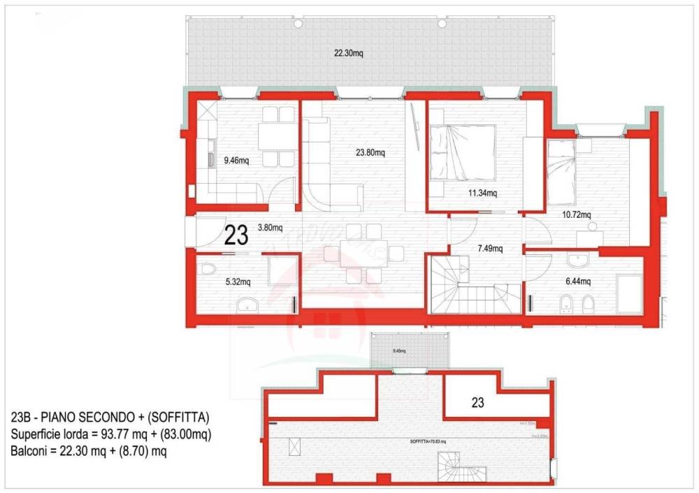 Da una scala interna si raggiunge il piano superiore, accatastato come soffitta, in cui è possibile ricavare un'ampia suite con bagno privato, accesso al secondo balcone e una capiente cabina armadio.