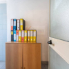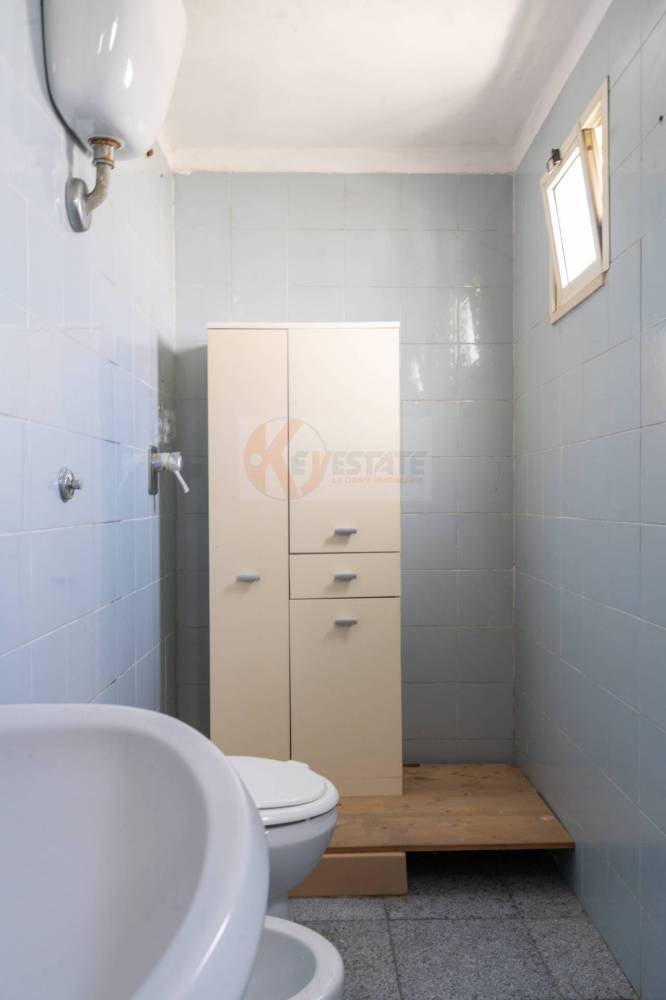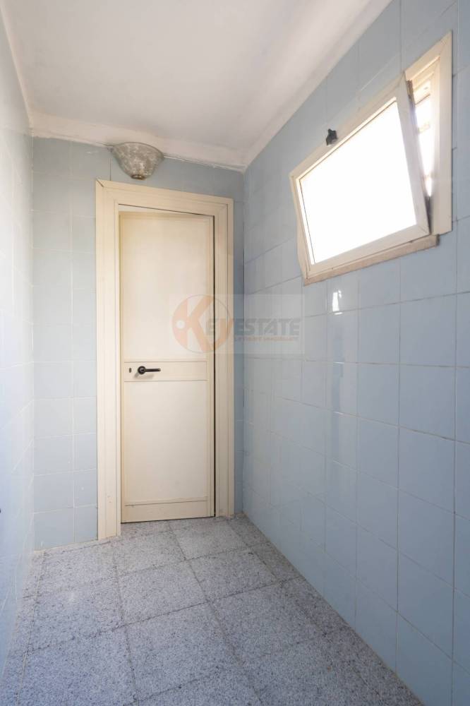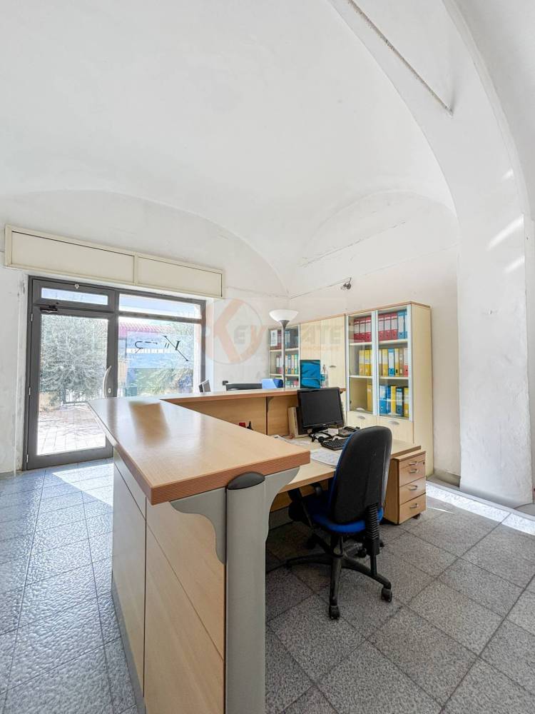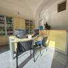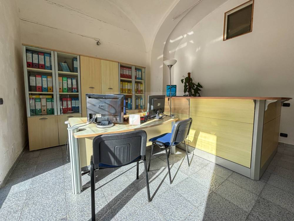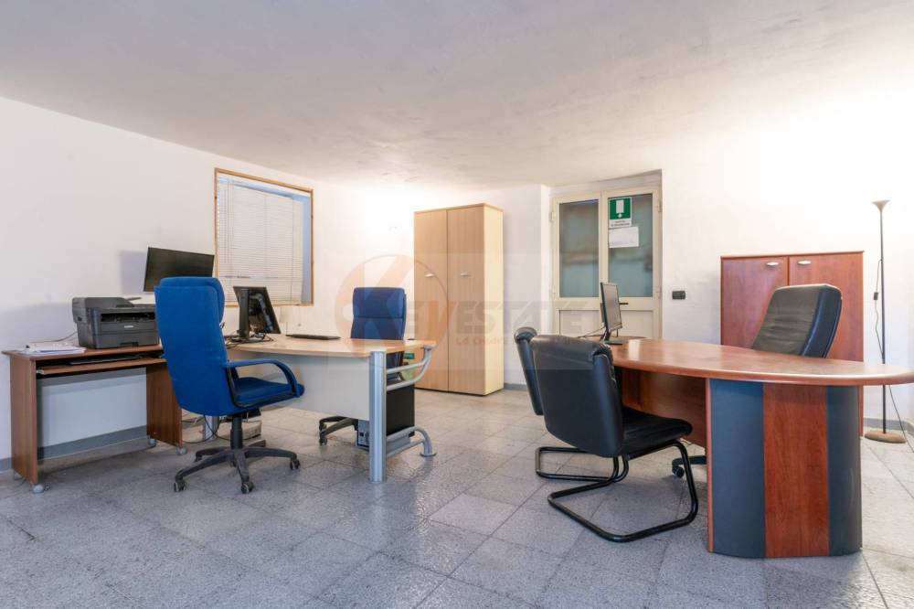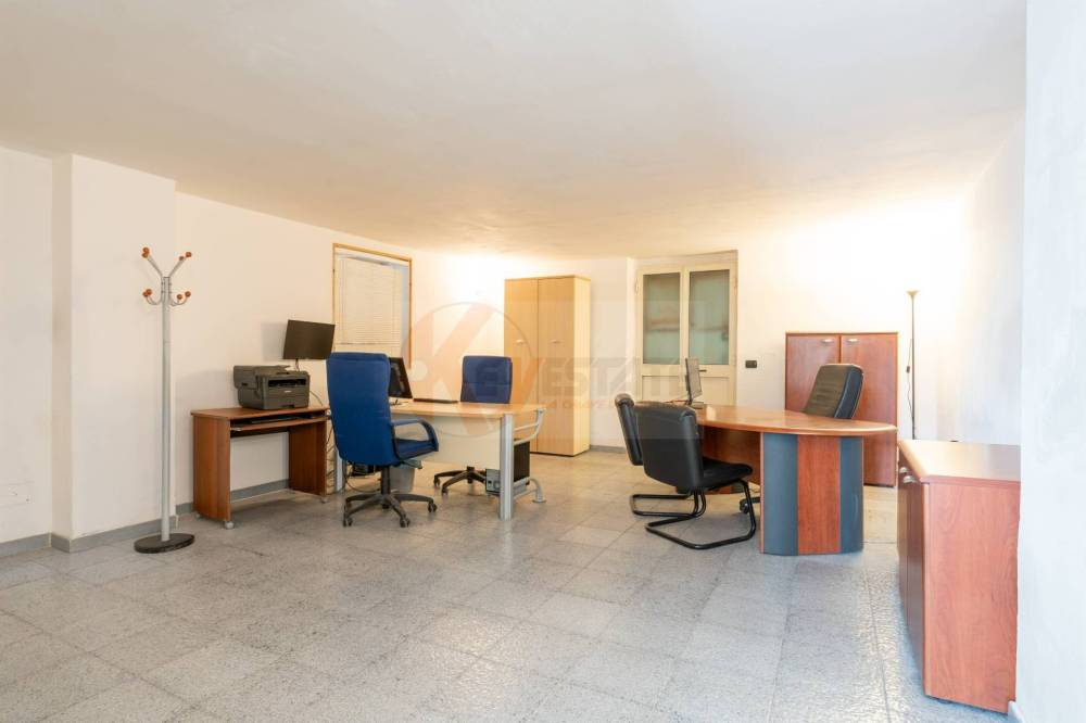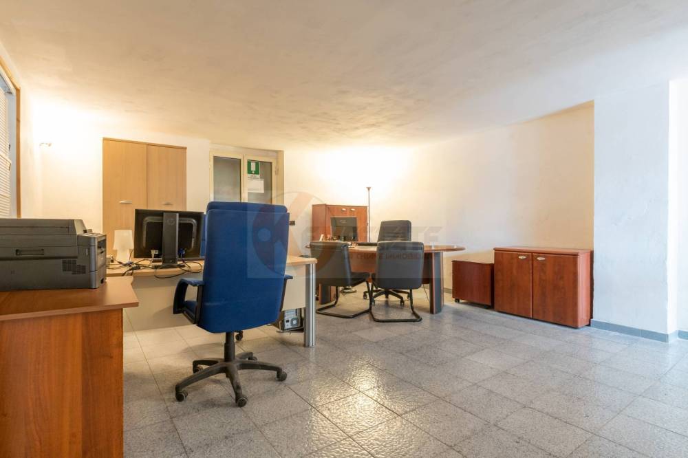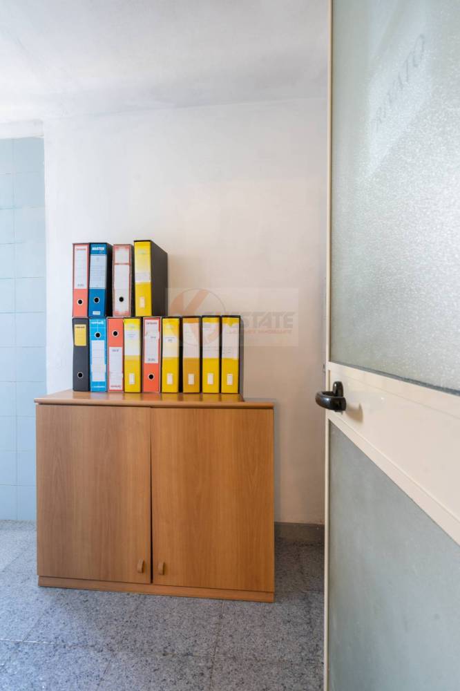 Il locale prosegue con un secondo ambiente regolare, oggi utilizzato come ufficio, in grado di ospitare comodamente due postazioni di lavoro con grandi scrivanie. Completano la proprietà un ampio antibagno, ideale anche come spazio deposito, e un bagno finestrato completo di servizi.