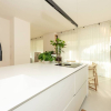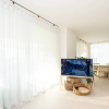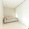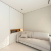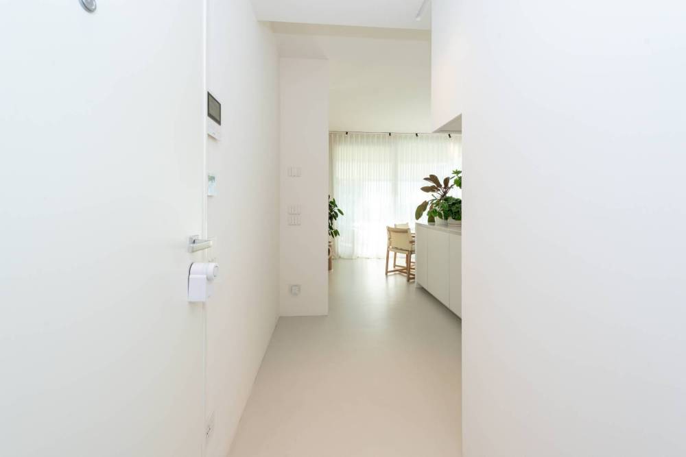 Pavimentazione in resina, serramenti in PVC con doppia vetrocamera e vetro accoppiato esterno, porta blindata, predisposizione impianto di allarme. Riscaldamento a pavimento con pompa di calore, raffrescamento canalizzato e sistema di domotica avanzata. Dettagli di interior design di gusto sobrio, tra cui carta da parati in fibre naturali, completano un ambiente elegante e sostenibile.