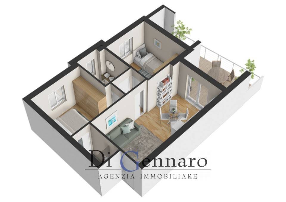 L'appartamento proposto in annuncio è un trilocale al primo piano composto da zona giorno con angolo cottura, disimpegno, due camere da letto matrimoniali e doppi servizi. Esternamente dispone di un ampio terrazzo di circa 20 mq.