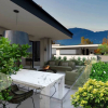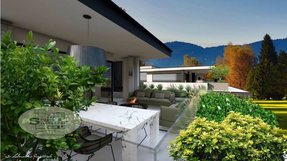 le ampie vetrate della zona giorno , protette dal cornicione , consentono un collegamento visivo interno/esterno molto piacevole e funzionale .