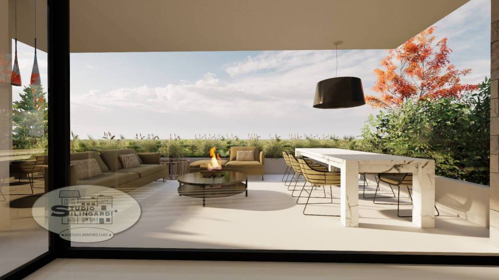 L'ATTICO è unico al piano, libero su quattro lati ; dall'ingresso si accede al soggiorno con cucina a vista ; finestre importanti si affacciano sull'esclusivo terrazzo quasi completamente coperto;