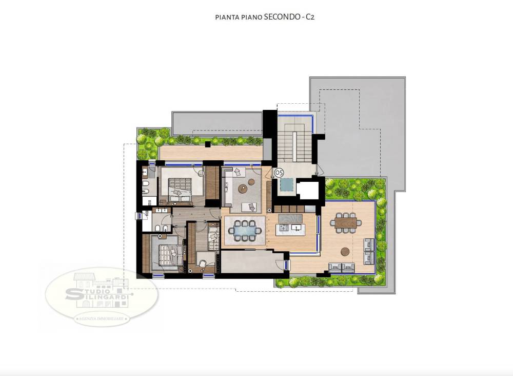 la zona notte dispone di tre camere e due bagni ; un vano tecnico è a servizio dell'attico ;