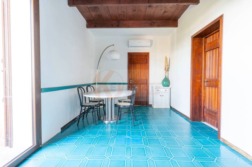 Lingresso si apre su una sala accogliente e luminosa, impreziosita dal soffitto con travi in legno che crea subito unatmosfera calda. Da qui accedi alla veranda esterna, ben esposta e riservata, ideale per condividere colazioni lente, cene al tramonto e momenti che restano nella memoria.