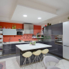 Cucina ad angolo con isola e secondo soggiorno con stufa a pellet