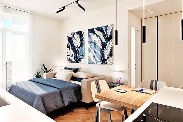 Internamente l'appartamento sarà composto da ampio ingresso con ripostiglio / lavanderia, ampio soggiorno/letto con angolo cottura e accesso al balcone, ampio bagno finestrato.