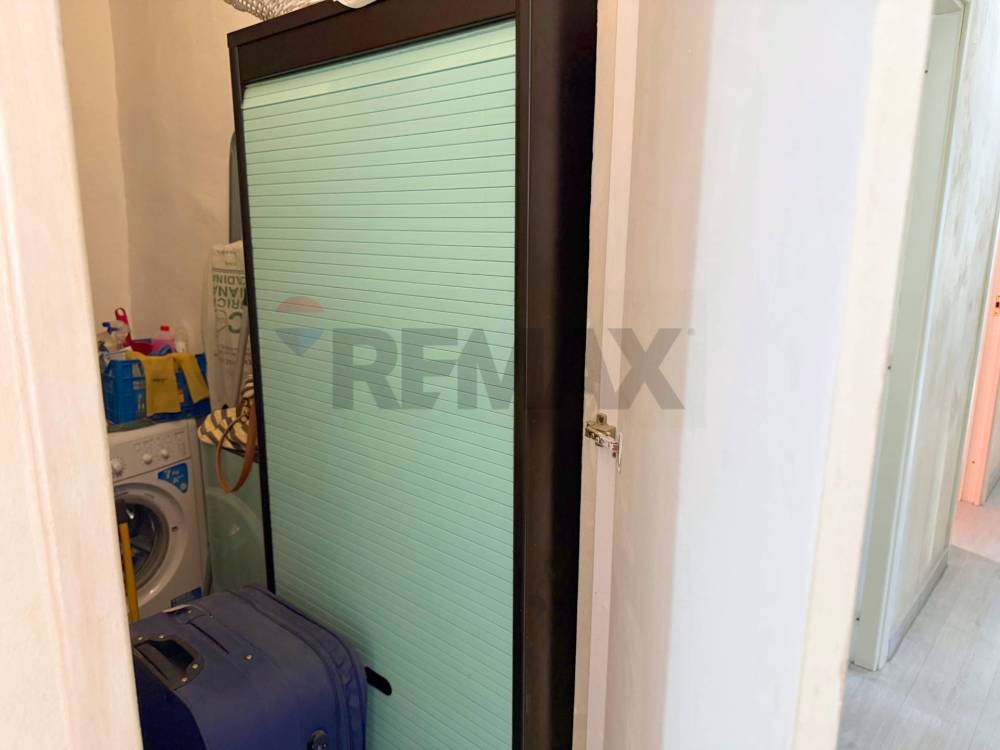 Un comodo ripostiglio, perfettamente organizzato e completo di lavatrice, consente di mantenere ordine e funzionalità, lasciando al bagno tutto il suo spazio e la sua eleganza.