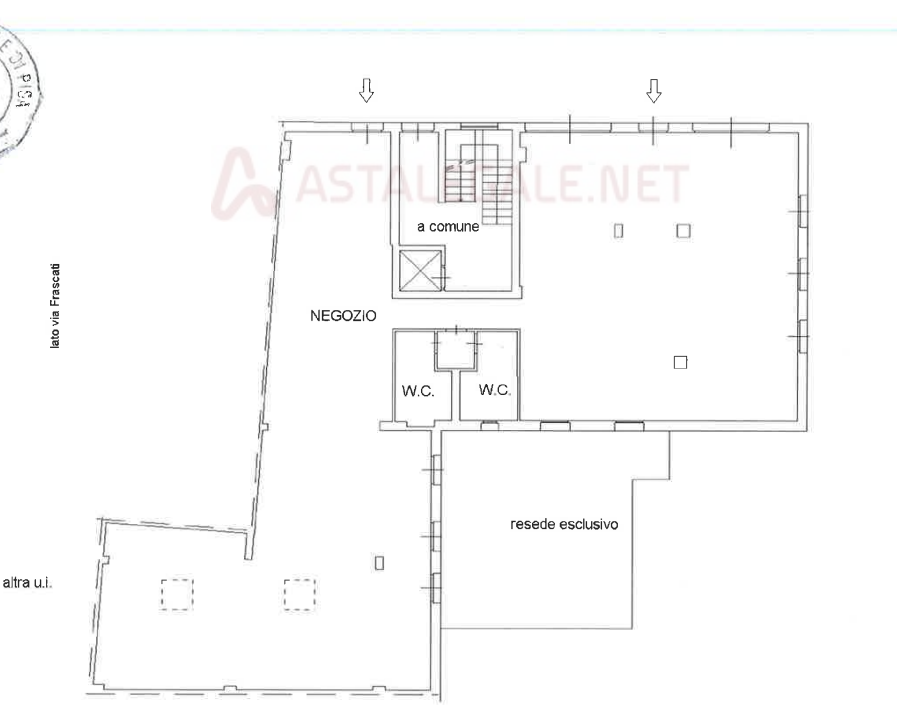 Negozio a Prato (PO) in Via del Melograno. Trattasi di ampio locale a destinazione terziaria posto al piano terra di un fabbricato più ampio, disposto su quattro piani fuori terra oltre a piano interrato, con unità immobiliari a destinazione promiscua residenziale e terziaria. L'unità immobiliare è composta da due ampi vani collegati tra loro da un corridoio: il primo, di forma pressoché quadrata, è situato sul lato nord-est e sud-est del blocco di edificio contraddistinto dalla lettera A, con accesso sia da Via del Melograno sia da Piazza Landini; dal medesimo vano si accede internamente, tramite il corridoio, al secondo ampio vano di forma pressoché trapezoidale. Lungo il corridoio sono presenti antibagno e due servizi igienici.