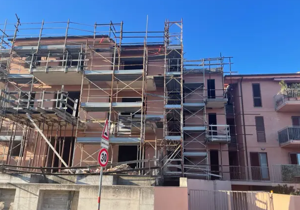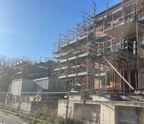 Trattasi di edificio residenziale in fase di realizzazione che sviluppa nove autorimesse e appartamenti, di cui tre al piano terra, tre al primo piano e altri tre al secondo piano.