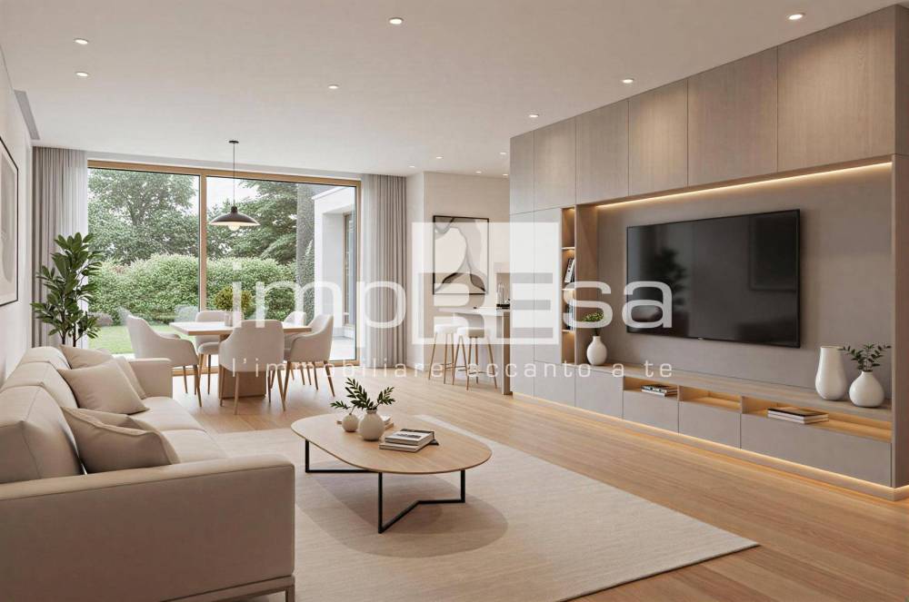 al p. terra l'ingresso che porta all'ampia zona giorno di oltre 43mq, caratterizzata da un'ampia vetrata che accede al giardino, un comodo bagno e il garage;