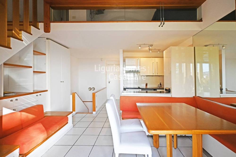 Il piano di arrivo offre la luminosa area soggiorno/pranzo con cucina con accesso al meraviglioso e ampio terrazzo porticato. Gli alti soffitti hanno permesso di creare un soppalco dove troviamo una salotto o eventuale zona letto, ed un bagno. Al piano giardino troviamo un disimpegno con armadi, una camera matrimoniale con bagno en-suite, una ulteriore camera matrimoniale con uscita sul giardino privato e un altro bagno. Una comoda cantina, accessibile anche direttamente dall'appartamento e un garage privato sono inoltre compresi nella vendita di questo esclusivo appartamento a Sanremo.