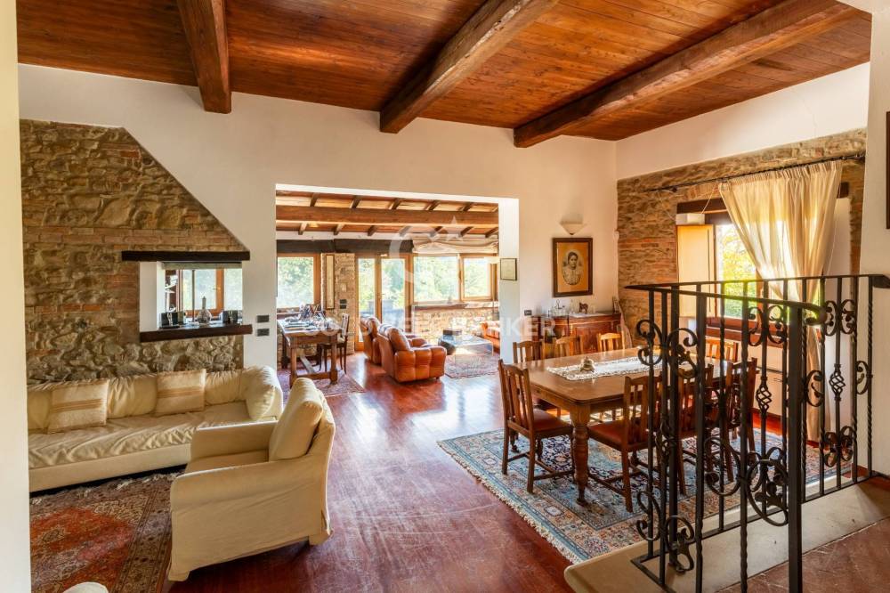 Il casale principale si sviluppa su due livelli. Al piano terra si viene accolti da una luminosa e ariosa zona giorno dove la luce filtra generosa da numerose finestre, valorizzando ogni dettaglio architettonico. La sala da pranzo, scaldata da un camino importante e autentico protagonista dell’ambiente, dialoga armoniosamente con la cucina adiacente, creando un’atmosfera conviviale ideale per momenti di condivisione e vita quotidiana. Un comodo ripostiglio e un bagno di servizio completano il livello, garantendo praticità senza rinunciare al carattere.