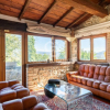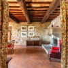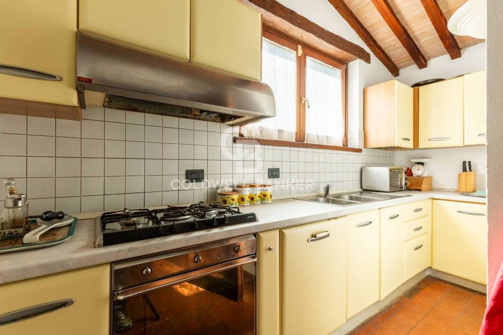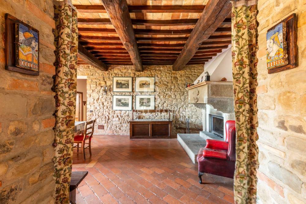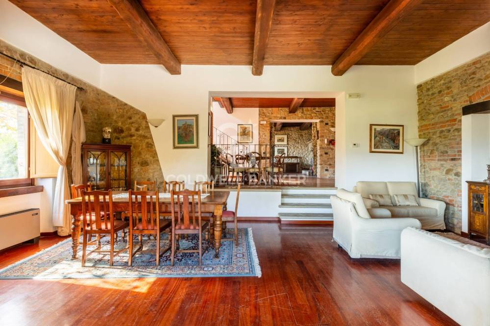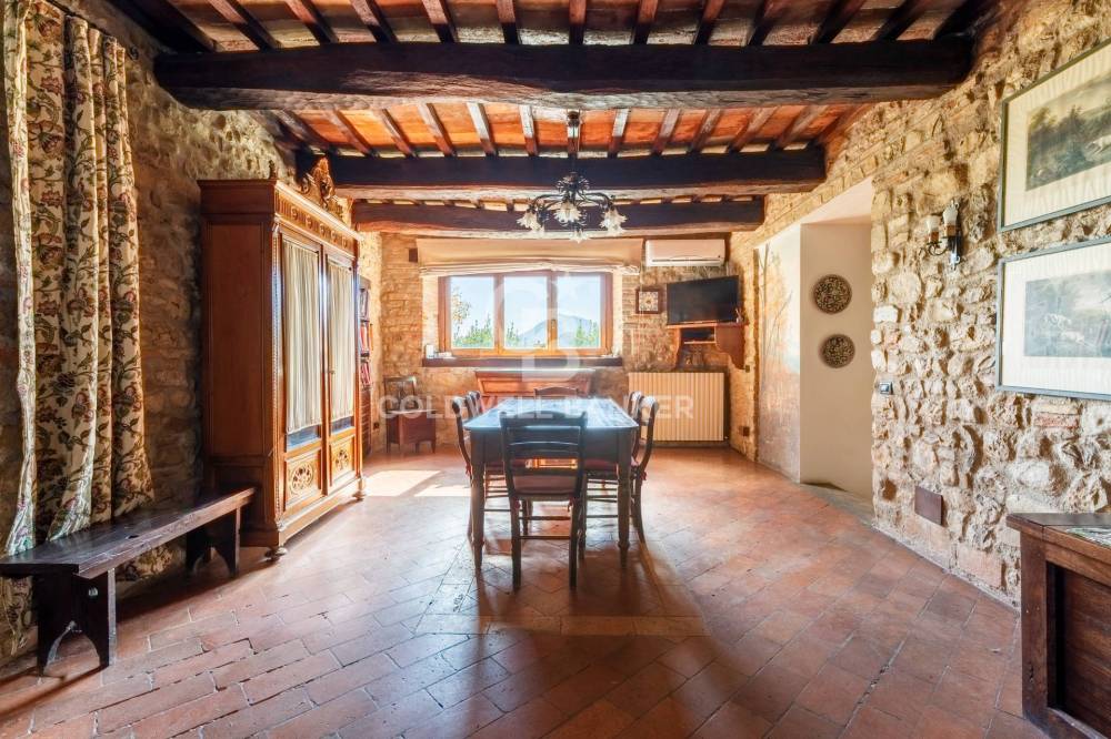 Gli interni conservano con eleganza i tratti più caratteristici della tradizione umbro-toscana: travi in legno a vista che attraversano ogni ambiente, pavimenti in cotto e murature in pietra nella zona giorno che raccontano il passato con calore. Il parquet nella zona notte restituisce una sensazione di intimità e comfort.