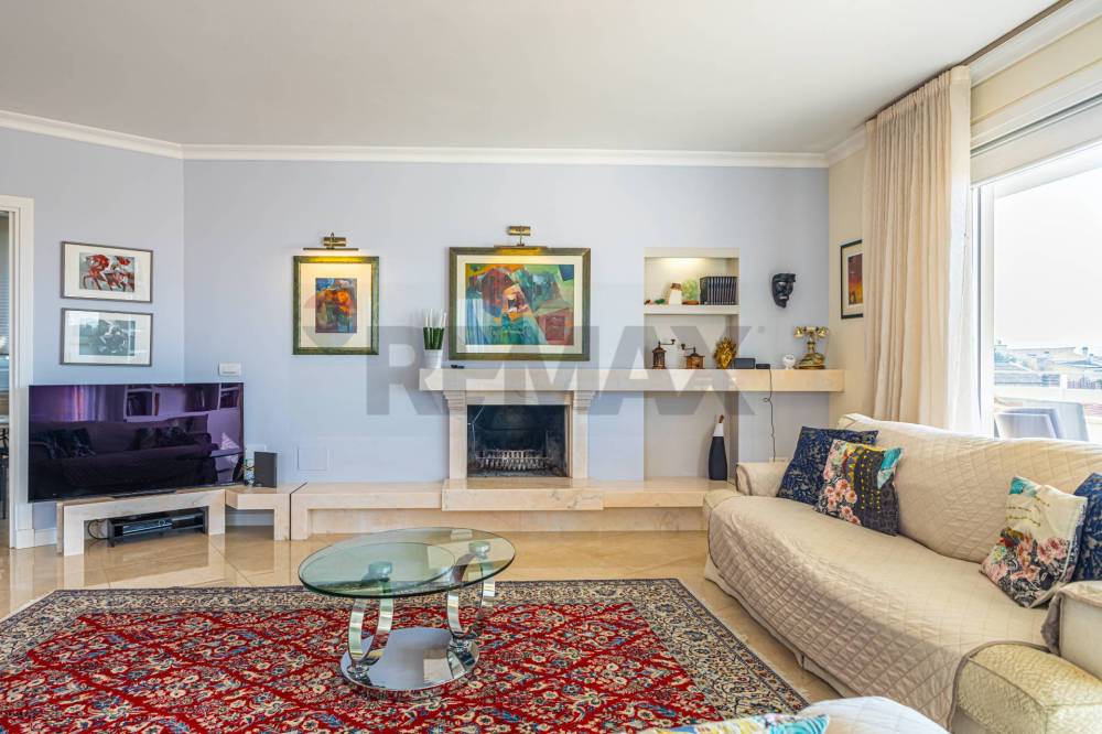 Ampio soggiorno con camino in marmo rosa