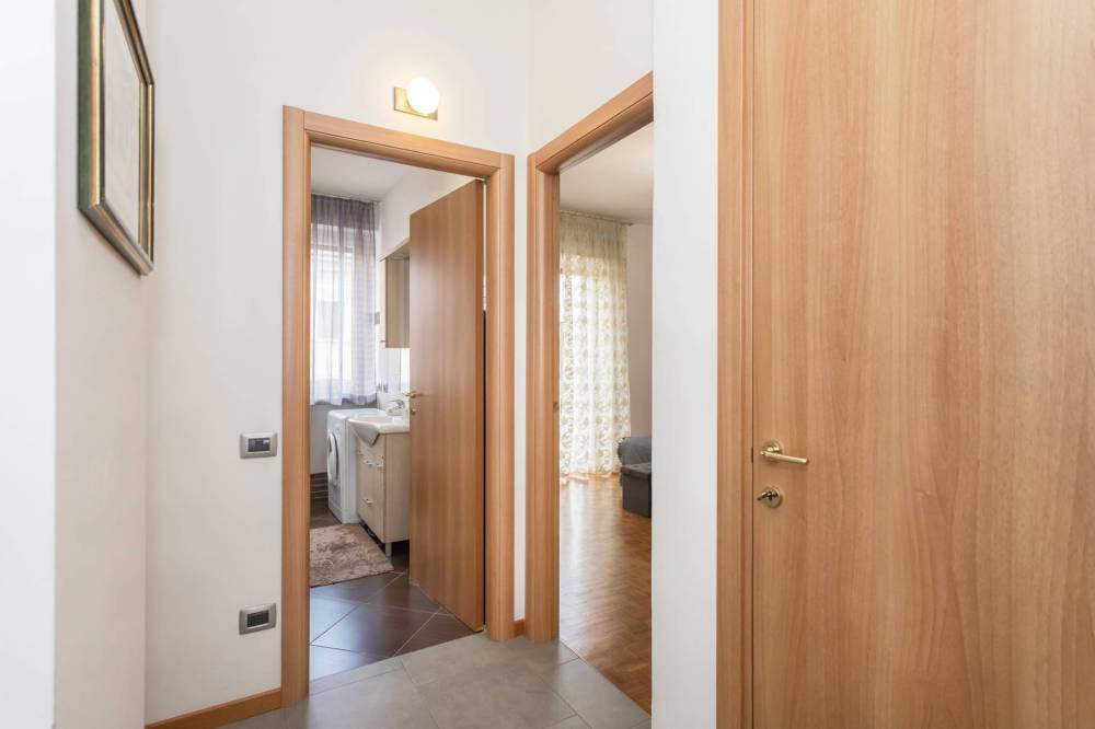 La soluzione si trova al terzo piano di palazzina dotata di ascensore e si compone di: ampia e luminosa zona giorno con angolo cottura a vista, disimpegno/ripostiglio, bagno finestrato con box doccia e lavatrice, camera matrimoniale. Due balconi. Tapparelle elettriche. Completano la proprietà un box auto singolo e una cantina.