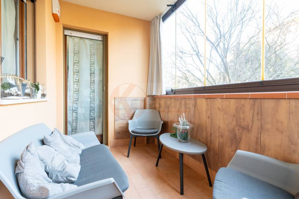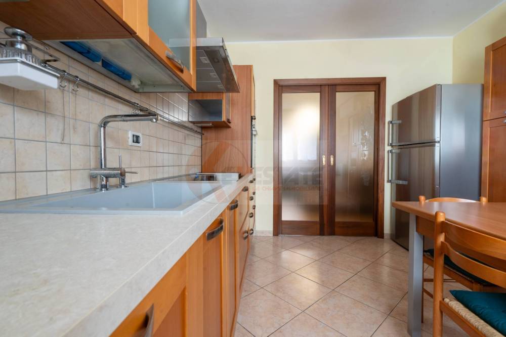 La cucina è separata e ben organizzata, collegata alla sala da una porta a scrigno che puoi aprire o chiudere a seconda delle esigenze. Dalla cucina si esce su un secondo terrazzo, anchesso chiuso con vetrate, dove è stata ricavata una comoda zona lavanderia, pratica e discreta.